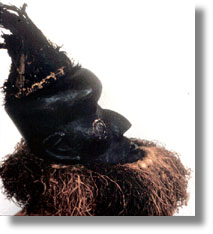 Click on the image to view a high resolution image. To return to thumbnails, use your computer's "back" button. Type: mask Ethnic Group: Binji Country: Democratic Republic of Congo (Zaire) ECU Number: L0002 Description: This wood helmet mask, Bwoom variant, has feather and raffia attachments, and a darkened surface. Significance researched to date: