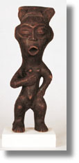 | This wood standing male figure has a large head and tall coiffure.Provenance: Kuba royal family |