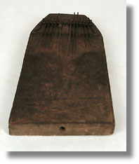 | A well known instrument, this type of ÒpianoÓ is used all over the Democratic Republic of Congo. Nearly every ethnic group created its own version. Sanzas have a varying number of keys, played in a variety of tunings. They are played with the thumbs and by alternately opening and closing the back hole with the middle finger of the left hand. The size of the box determines the resonation; the metal stripsdetermine the pitch. The music is strongly polyphonic. Contrapuntal melodic lines are played and sung simultaneously, creating polyrhythms.Sanzas are usually used for music for entertainment rather than for ritual purposes, and are are often played along with stick zithers and small harps or rattles. Individuals or small groups, often young boys or girls, gather and Òjam.Ó Love songs or ballads are usually played.This sanza is made of a solid piece of wood with 18 iron keys of 14 different lengths which vary the pitch. The shorter keys produce a higher pitch, and the longer keys, a lower pitch. The keys rest above the surfaceof the wood on another metal strip and are plucked with the thumbs. The edge is carved with typical Kuba parallel diagonal lines.