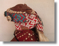 | The Mwaash aMboy mask is by far the most important of all royal Kuba masks. According to oral accounts, the mask is primarily a symbol of the cultural hero Woot, the founding father of the Kuba, and represents the son of Woot. Woot was responsible for the creation of the royalty, the political structure, and the arts and crafts of all the Kuba peoples. The mask can be worn only by men of royal descent or by representatives of the people. The ritual use of the mask is manifold and variable in the Kuba culture. It is worn at initiations, validates kingships, sanctions matrilineal dynasty succession, and appears at funerals. The privilege of wearing the Mwaash aMboy extends beyond the grave, for the royalty were buried with these masks on their heads.Constructed of wood, palm leaf fibers, leopard skin, hair, cowrie shells and beads, the mask is an assemblage of materials. Complex symbolic designs are displayed in the multicolored beadwork. These designs are also used on other royal objects such as drums, textiles, and basketry. The top is made of a soft cloth onto which feathers or fan-like ornaments were attached for dances. Other examples have long tubular extensions representing the elephant trunk, also a symbol of royal power.(Gillon, 304, Pruitt, lecture 12/1/93)