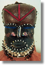 Click on the image to view a high resolution image. To return to thumbnails, use your computer's "back" button. Type: mask Ethnic Group: Kuba (Bakuba) Country: Democratic Republic of Congo (Zaire) ECU Number: L0009 Description: This wood helmet mask is decorated with copper, shells, and beadwork in blue, red and yellow. Significance researched to date: