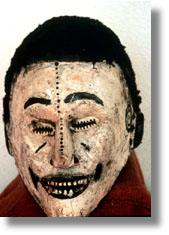Click on the image to view a high resolution image. To return to thumbnails, use your computer's "back" button. Type: mask Ethnic Group: Ibo (Igbo) Country: Nigeria ECU Number: L0021 Description: This wood helmet mask, Mmwo, has attached human hair, and black and white pigments. Significance researched to date: