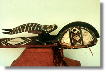 | This wood mask has antelope and tall geometric crown projection, and red and white pigments. |