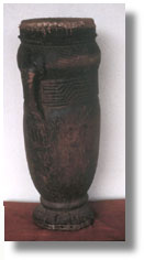 | Drums are the most important instruments in Africa. They are diverse in construction and produce the most dominant sound. They have been very important in village and court activities. Made of wood, they comprise two basic groups--skin drums and slit drums. Skin drums are made by stretching hides over wood; slit drums are made entirely of wood. Some slit drums consist of sections of tree trunks, and others are constructed boxes. Large ÒtelegraphÓ slit drums were used to send messages from one village to the next, up to 15 miles apart, concerning births, deaths, graduations, feasts, the arrival of visitors, or court ceremonies. They also called hunters to the hunt and warriors to war. Because of their large size, they were never moved. The king used drums to reinforce his power and prestige, as a part of his regalia. Beating out polyrhythms, they accompany singers and dancers in royal, religious, and social events. This ceremonial drum has carved geometric forms, a handle carved with a hand, and a skin drumhead. It shows native repairs. It originated with the Bushoong, a clan within the Kuba kingdom consisting of over 100 villages. (Schweinfurth quoted in Sieber, 111, Wassing, 146,156)