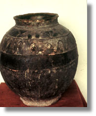 | This dark brown pottery vessel is of rounded form with a short wide neck, modeled with various devices. |