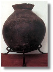 | This dark brown pottery vessel is of rounded form, with a short flaring neck and geometric designs. |