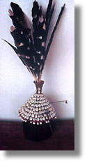 | ThiswomanÕs hat has cowrie shells, a feather crest, and two pins. |