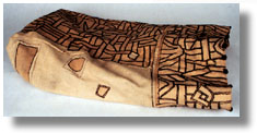 | This Bushoong textile Ntshak has a pom-pom border, with closely-set brown on cream panels of eccentric geometric design.Provenance: Kuba Nyimi |
