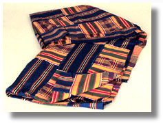 | This Ashanti Kente cloth has multi-colored (yellow, red, blue,green,purple) panels of geometric designs. The national costume of Ghana is kente cloth, woven on narrow strip looms by men. The name means Òwhatever happens to it, it will not tear.Ó The cloths present specific messages in their traditional geometric desgins that refer to an idea, proverb, or historical event. Originally made of raffia and cotton dyed with natural dyes, they later used European silk, and, now, rayon. |