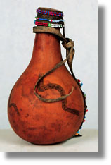 | Calabash gourds were used widely to carry water or palm wine. Bead designs identified the ethnic group or clan. Knots indicated the village it came from, and colors signified the family. Often a shoulder strap was used to carry the gourd, and a small wrapped cloth underneath stabilized it when it was set down. (Wilson, interview, 12/30/95)