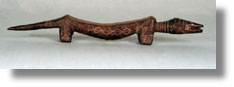 | Made of wood, this Òrubbing oracleÓ was used as a divination tool. The diviner rubbed the wooden attachment over the back of the animal figure. If it stuck, the person was guilty. ÒA crocodile never liesÓ was a local saying. This piece appears to be a crocodile, simplified and abstracted, with notched teeth and a long tail. Representative Kuba diamond designs are carved on the side, legs and tail. Evidence of red pigment, possibly tukula powder, is visible in the recessed areas.(Fagg, 32, Pruitt lecture 11/10/93, Torday quoted in /Walker, 10-110)