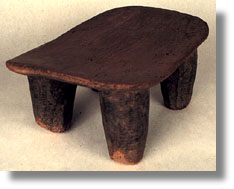 This wood stool has four sturdy legs and rectangular seat. Stools serve as social insignia.