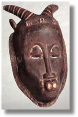 Click on the image to view a high resolution image. To return to thumbnails, use your computer's "back" button. Type: mask Ethnic Group: Baule Country: Cote d'Ivoire (Ivory Coast) ECU Number: W0016 Description: This Baule mask,with protruding lips, facial cicatrices, and short grooved horns, has residual kaolin and a good patina. Significance researched to date: