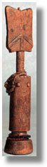 This wooden female Fanti akuaĆba fertility figure has a rectangluar head, ringed neck with beads, and cylindrical body terminating in a rounded socle. The body is incised, and the facial form is unusual. It has a fine patina.
