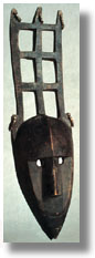 | This Bambara mask with a three-horned superstructure forming six open rectangles has beads attached and a fine old use patina. |