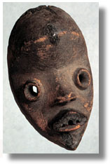 | This NÕGuere mask is an excellent example with protruding cylindrical open eyes and a fine use patina. |