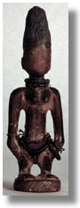 Significance researched to date: The twin birth rate among the Yoruba is proportionately high compared to other geographic regions. Because twins double the financial burden, twins born in poor families were formerly put to death. The ruling families, however, instituted a twin cult under instructions from an oracle, which said that the killing of twins was offending Shango, the god of thunder. Mothers of twins had to dance to Ibeji, the spirit of twins, every five days. Offerings of food are thought to placate the spiritÕs temperament. Upon the death of a twin, the mother commissions an ere figure. If both twins die, two ere figures are carved. If the ere figure is not provided, the Yoruba believe that the soul of the deceased will seek vengeance by bringing terrible misfortune to the other twin or to the entire family. Ere figures are carved as the same sex as the deceased twin, but as an adult, with breasts and genitals indicating strength. Often the family Ila scarification marks are included. Indigo dye and ground camwood are rubbed on to beautify and protect the figures from harm. Beads associated with the orisa worshipped are selected. Cowrie shells or brass rings, cloths, finely detailed coiffures or hats are also carefully chosen. The ere ibeji are placed on the household altar. There they are fed and clothed just as the surviving twin is fed and clothed to placate Shango. Ere ibeji figures are dedicated to Shango, by the application of campowder. Shango is also known as Oko Ibeji, Òthe husband of twins.Ó The twinsÕ connection to Shango can also be seen in the clothing provided for the figures. Often tiny capes of cowrie shells are made for the figures. These capes, called Ewu Shango, are miniatures of the ones worn by priests during the Shango ritual. The cowrie shell symbolizes Shango in that he is the god of material wealth and the cowrie shell is an ancient form of money. With the death of the mother, Ifa is consulted. Ifa summons the spirit of Ibeji, who determines what should happen to the ere ibeji. Sometimes the figure is buried with the mother. Other times, the figure is passed to another family member to be cared for. (Drewal, 170-5; Perani, 147-8; Ulrich, 2; Gillon, 244)