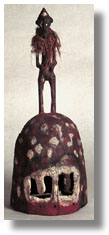 Click on the image to view a high resolution image. To return to thumbnails, use your computer's "back" button. Type: headdress Ethnic Group: Senufo Country: Cote d'Ivoire (Ivory Coast) ECU Number: W0070 Description: This Senufo, Deguele, helmet headdress has a figure, over-all polychrome spots, and raffia. Significance researched to date: