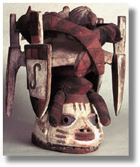 Click on the image to view a high resolution image. To return to thumbnails, use your computer's "back" button. Type: headdress Ethnic Group: Yoruba Country: Nigeria ECU Number: W0079 Description: This Yoruba, Gelede society, headdress, with bird, snake and knives motif, is polychromed and has a fine patina. Wth stand. Significance researched to date: