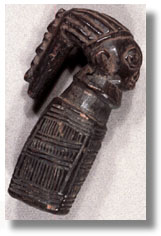| This Yoruba Eshu figure was used by a priest as part of an elaborate costume worn when ere ibedji figures are blessed. It has sring earrings and a good patina. |