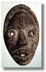 Click on the image to view a high resolution image. To return to thumbnails, use your computer's "back" button. Type: mask Ethnic Group: Dan Country: Liberia ECU Number: W0101 Description: This Dan-Guere mask has open cylindrical eyes, protruding exaggerated lips, a grooved coiffure, and a weathered, natural good patina. Significance researched to date: