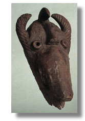 This Dan? Geh mask has grooved horns, a central bird, protruding cylindrical eyes, and a long open beak. It is an exceptionally fine old piece with a good old use patina. [Ivory Coast/Liberia]