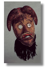 This Dan mask, with heavy facial encrustation, has ram's horns, metal-encircled eyes, black cord and fur, a sacrificial patina, fine use patina, and holes for raffia. [Liberia/Ivory Coast]