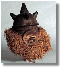 This Bayaka mask/headdress, is a Ndemba initiation mask, Yaka with Suku influence. It is complete with raffia, polychromed,with a carved wooden cap. It is a finely carved, rare example with a fine patina.