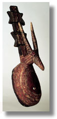 | This Mossi wooden mask has a rounded, convex face with diminuitive eyes and cross-hatched designs, surmounted by an antelope head and horns and by a cubistic superstructure behind, incised and polychromed. It has residual pigment and a fine use patina. On stand. |