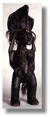 | This Senufo shrine altar figure is inthe form of a human female with elongated face surmounted by a full figure of Calaou with outspread wings touching a serpent's head (Porpianong) from forehead. It has monkey hair swatches and cowrie shells, and ia a rare example, blackened with a fine use patina. |
