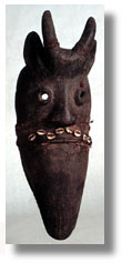 Click on the image to view a high resolution image. To return to thumbnails, use your computer's "back" button. Type: mask Ethnic Group: Unknown Country: Unknown ECU Number: W0136 Description: This Geh mask has a moustache of cowrie shells, hair beard, red fabric, and encrustation. Significance researched to date: