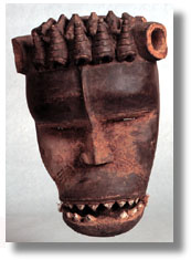 | This Dan Guere mask has a moveable lower jaw, upper and lower teeth, crown carved to represent mollusk shells (two rows), detachable horns covered with dark cloth, brass tacks, a linear vertical forehead center. The central part of the face has some residual material, and the mask has a fine sacrificial and use patina. [Liberia/Ivory Coast] |