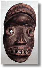 Click on the image to view a high resolution image. To return to thumbnails, use your computer's "back" button. Type: mask Ethnic Group: Guere Country: Liberia ECU Number: W0140 Description: This Guere mask has round tubular open eyes, metal teeth, square raffia holes, and an old use patina. Significance researched to date: