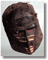 This anthropomorphic monkey mask, possibly Dan-Guere or Guro, on socle, is crude, with horizontal lines acros face, and is polychromed, with a use patina. [Liberia/Ivory Coast]