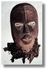 Click on the image to view a high resolution image. To return to thumbnails, use your computer's "back" button. Type: mask Ethnic Group: Dan Country: Cote d'Ivoire (Ivory Coast) ECU Number: W0148 Description: This Dan-Guere mask has metal-encircled slit eyes, a fiber beard, encrustation, and a patina. Significance researched to date: