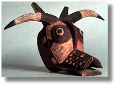 Click on the image to view a high resolution image. To return to thumbnails, use your computer's "back" button. Type: headdress Ethnic Group: Bobo Country: Burkina Faso (Upper Volta) ECU Number: W0154 Description: This Bobo bovine headdress has a triangular mouth and goat horns. It is well carved, polychromed with earth pigments, and has a good use patina. Significance researched to date: