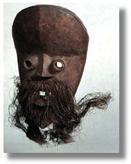 This Dan Kran mask has in-set copper teeth, tubular eyes, and a fine raffia beard. It is well carved, blackened, and has a good patina. [Ivory Coast/Liberia]