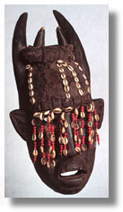 This Guere mask with four horns is partially overlaid with metal strips, and has leather packets filledwith ju-ju, cowrie shells and beads, fabric, and fur.
