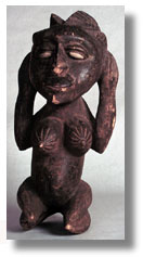 | This pair of Bagga/Koronko squatting figures is well carved, with a good use patina and kaolin on the eyes. [A. Male has hands pointed under chin, elbows resting on knees, a patch of cloth on the head and back, cowrie shells on left wrist,and red beads on right wrist. - see W0051] B. Female has hands to ears, incised breasts. |