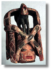This polychromatic, Yoruba Gelede Society headdress with daggers, has a head surmounted by an elephant and a snake. It is well carved and has old use patination. With stand.