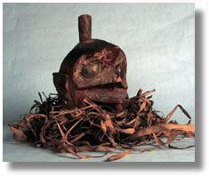 This Fon Yoruba [Dahomey/Nigeria] helmet headdress, carved to fit entirely over the dancer's head, is a rare type. It has residual pigment, especially reddish around mouth, a face covered with feathers, intact raffia, and copper eyes.