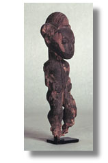 Click on the image to view a high resolution image. To return to thumbnails, use your computer's "back" button. Type: figure Ethnic Group: Baule Country: Cote d'Ivoire (Ivory Coast) ECU Number: W0166 Description: This finely carved, Baule standing male figure has a good use patina, but is eroded in several areas. With stand. Significance researched to date: