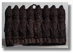 Click on the image to view a high resolution image. To return to thumbnails, use your computer's "back" button. Type: other Ethnic Group: Unknown Country: Nigeria ECU Number: W0167 Description: This Benin bronze plaque, with a central hook for handing, has eight more or less identical figures (priests or warriors) in a row. With stand. Significance researched to date: