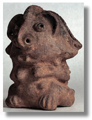 | This Dogon terracotta figure has a traditionally-handled head and miniaturized body. It is well modeled with a good patina. |