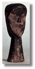 This Dan fetish figure [Liberia / Ivory Coast], with a human face on a conical neck, has a sacrificial patina. A tag attached to the piece reads, ÒDan Mace.Ó