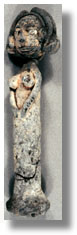 Click on the image to view a high resolution image. To return to thumbnails, use your computer's "back" button. Type: ritual object Ethnic Group: Unknown Country: Central African Republic ECU Number: W0176 Description: This very rare Poupee (doll) fetish, female, constructed on a core of wood using grass, manure and clay, is hand molded and fired. Significance researched to date: