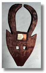 This Bobo (Gurunsi influence) mask has a flat face with triangular ears in the same plane, bull's horns, a mirror rectangle set into the forehead, square eye holes, and old use patination.