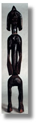 This Chamba/Mumuye standing female ancestral figure has an attenuated arm, enlarged hands, a flanged, serrated coiffure. It is a powerful figure, showing dynamic torsion in arm forms. It is blackened and has a good use patina.