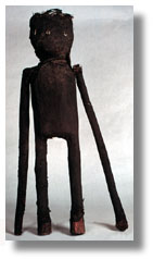 Click on the image to view a high resolution image. To return to thumbnails, use your computer's "back" button. Type: figure Ethnic Group: Senufo Country: Cote d'Ivoire (Ivory Coast) ECU Number: W0211 Description: This Senufo Kafigueledio figure is made of wood covered with loosely woven cloth, a sacrificial patina, and feathers on the head. Significance researched to date: