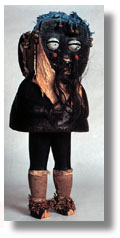 | This rare Guere, Poro Society guardian figure is in the form of a squattish-shaped human figure on tiny feet with a wood carved Guere mask on one side and remnants of skin on the other side. |